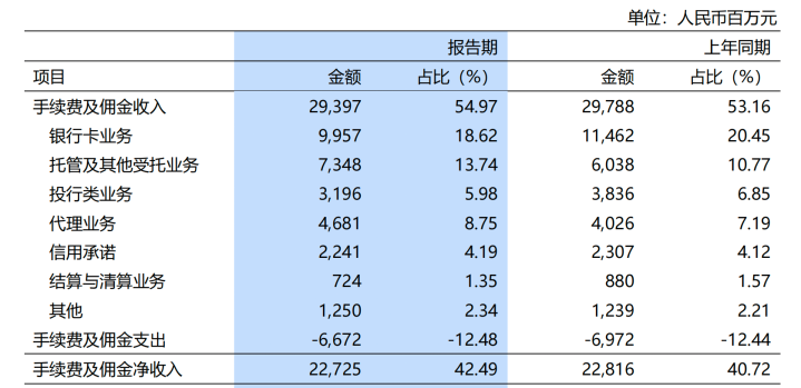 在手续费及佣金收入中,银行卡业务收入同比下降了13.13%,托管及其他受托业务收入同比增长21.70%,投行类业务收入同比下降16.68%,代理业务收入同比增长16.30%。